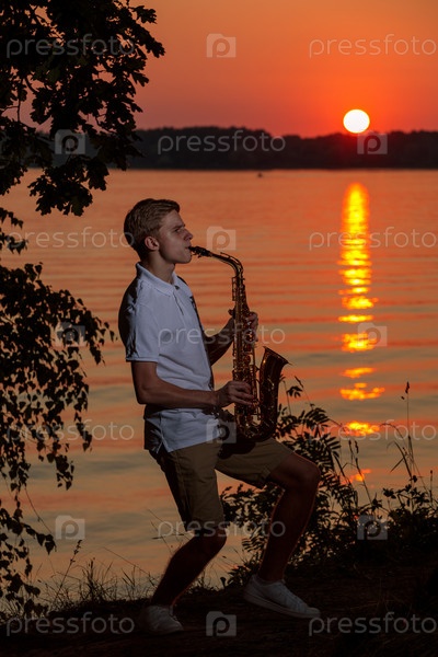 Молодой парень играет на саксофоне вечером на закате
