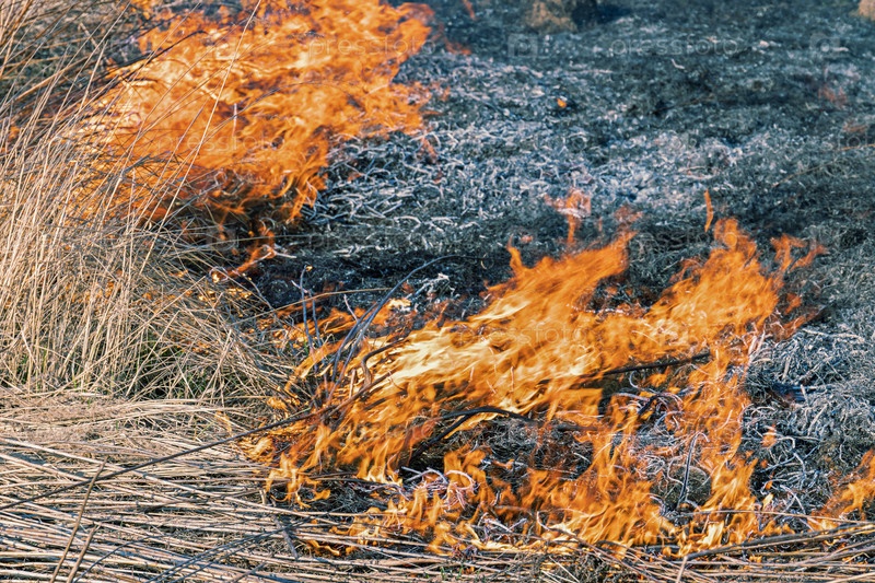 Сухая трава горит весной на лугу в сельской местности. огонь уничтожает сухую траву. Оранжевое пламя и клубящийся дым. Опасность и стихийное бедствие. Апрель 2020, Тульская область, Россия