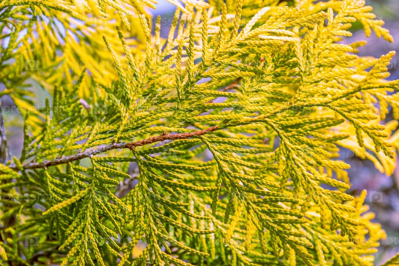 Желто-зеленая текстура листьев западной туи thuja occidentalis Aurea. вечнозеленый ландшафтный сад. крупный план