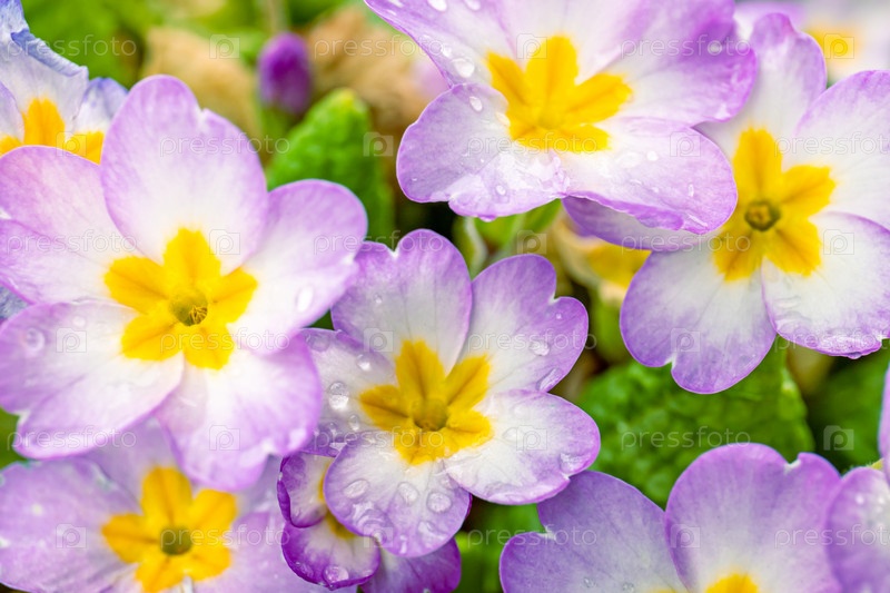 Цветы светло-розового первоцвета обыкновенного, примулы лат. Primula acaulis или primula vulgaris на фоне зеленого листья с капельками дождя. Концепция весеннего пробуждения природы. крупный план