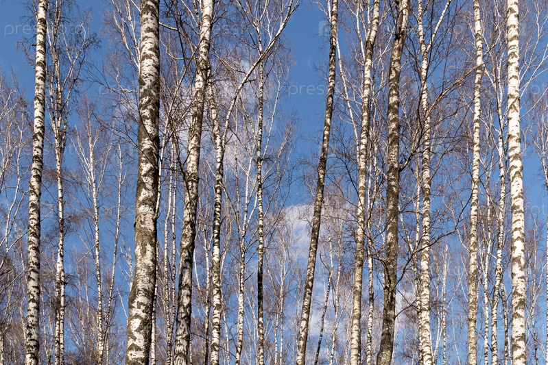 Белые березы на фоне голубого неба в парке. весенний пейзаж