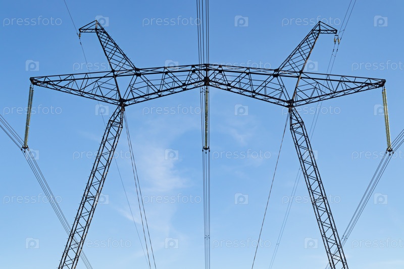 Поддержка высоковольтной линии электропередач на фоне голубого неба и солнечного света. крупным планом