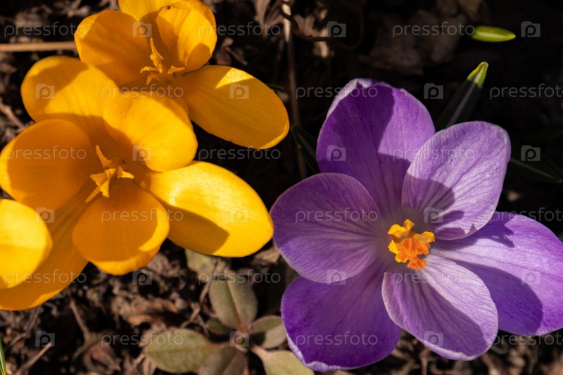 На клумбе цвели желтые и сиреневые крокусы. весенние цветы. крупным планом