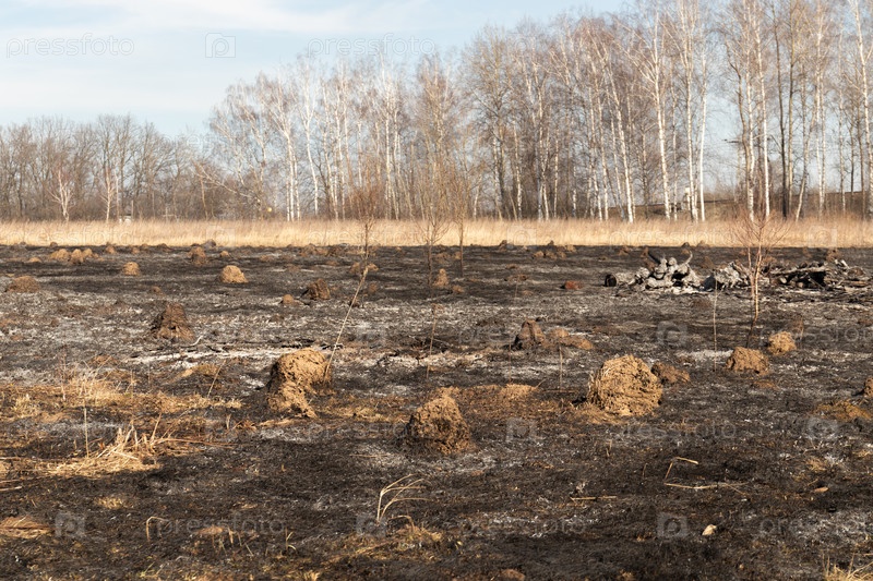 Сгоревший луг в сельской местности, огонь уничтожил сухую траву весной