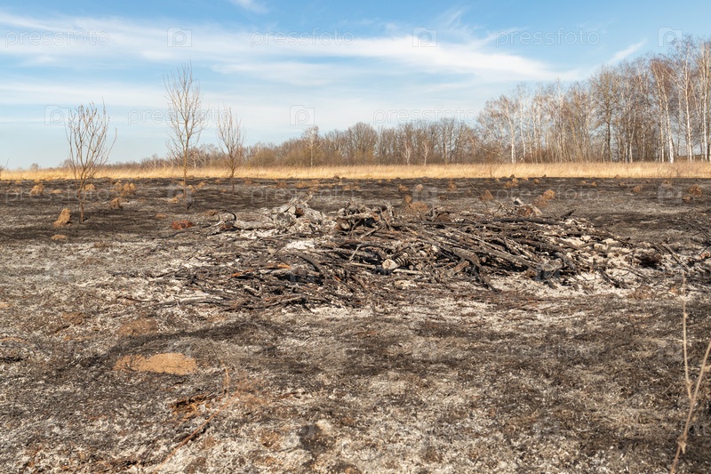 Сгоревший луг в сельской местности, огонь уничтожил сухую траву весной