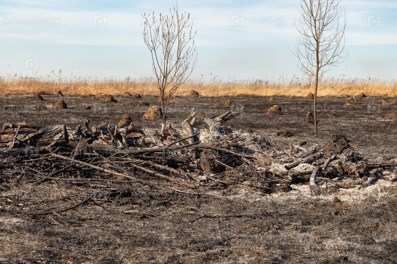Сгоревший луг в сельской местности, огонь уничтожил сухую траву весной