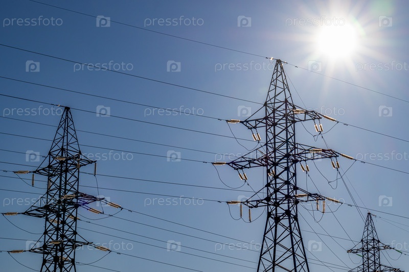 Поддержка высоковольтной линии электропередач на фоне голубого неба и солнечного света. для дизайна и фона