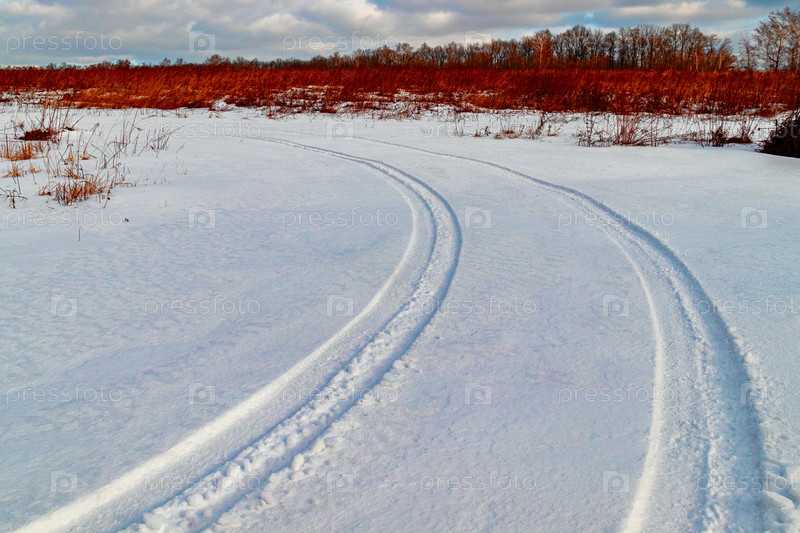 След автомобильных шин на пустой зимней проселочной дороге. зимний пейзаж
