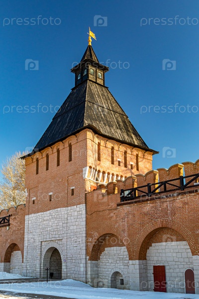 Тула, Россия-февраль 2020: прекрасный вид на Ивановскую башню Тульского Кремля. зимний пейзаж