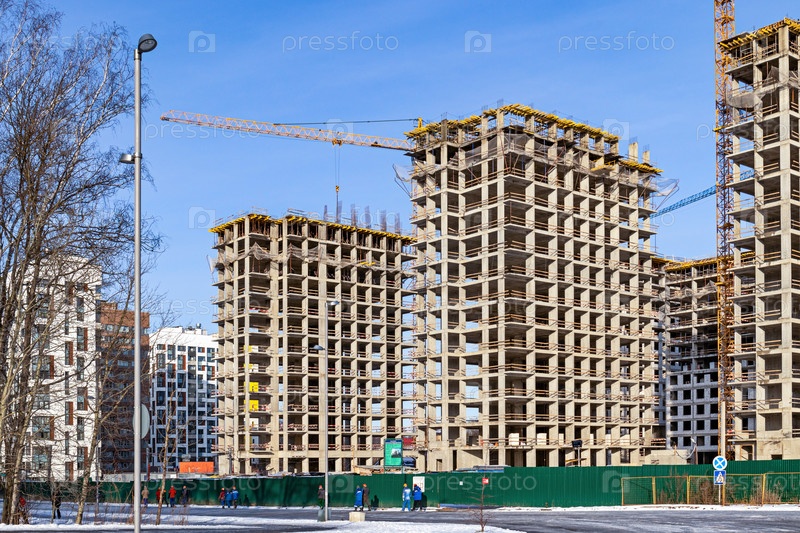 Строительство третьей очереди нового жилого комплекса «В лесу». Работа строительных кранов, идет возведение стен зданий. Москва, Россия