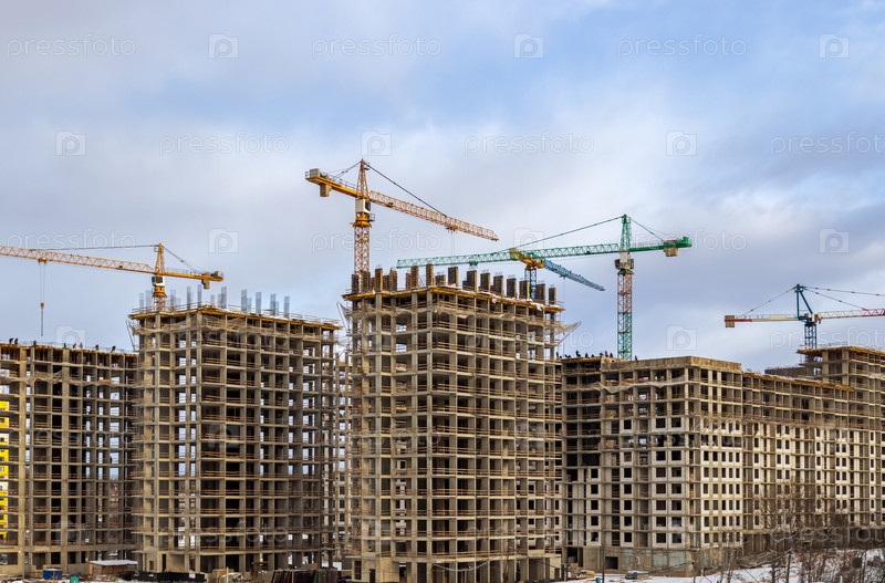 Строительство третьей очереди нового жилого комплекса «В лесу». Работа строительных кранов, идет возведение стен зданий. Москва, Россия