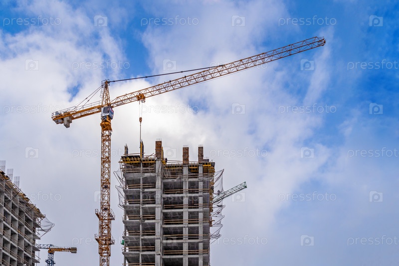 Строительство третьей очереди нового жилого комплекса «В лесу». Работа строительных кранов, идет возведение стен зданий. Москва, Россия