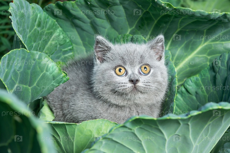Британский серый короткошерстный котенок сидит в капусте крупным планом. Концепция праздника урожая и забавное фото