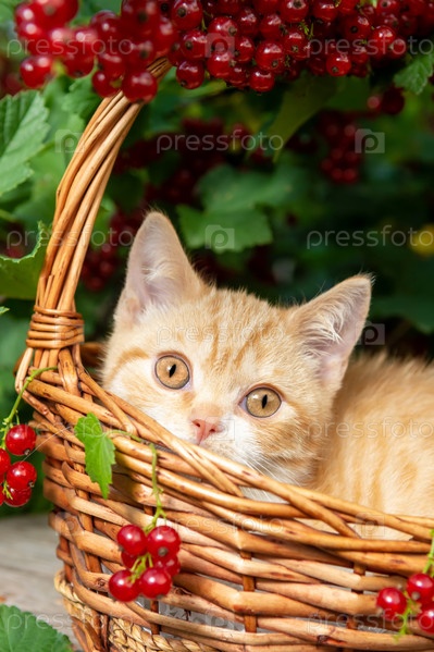Британский рыжеволосый короткошерстный котенок сидит в корзине из лозы на фоне куста смородины с красными ягодами