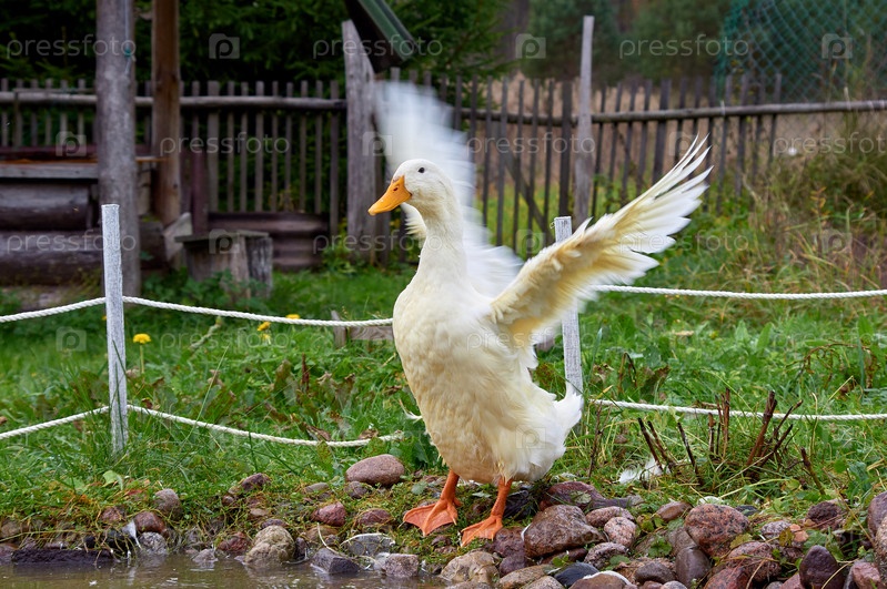 Белая утка размахивает крыльями