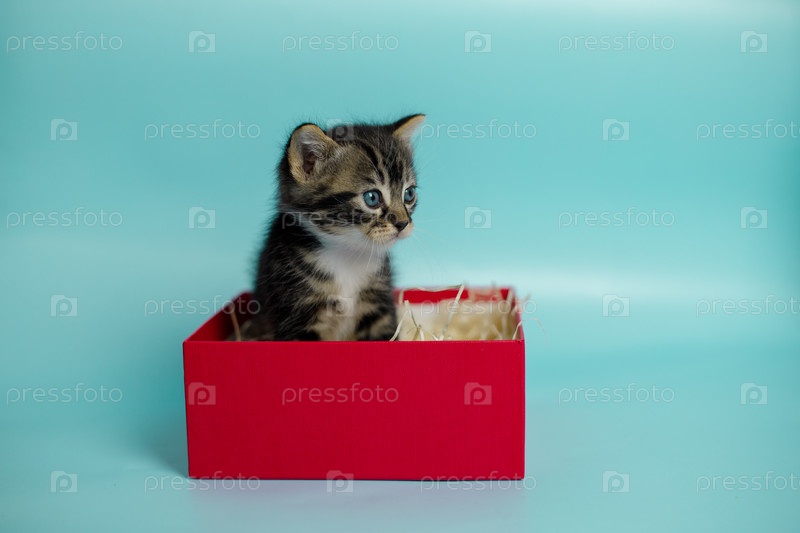 Крупный план милого полосатого котенка, сидящего в красной подарочной коробке на синем фоне. Пустое место для текста. Макет