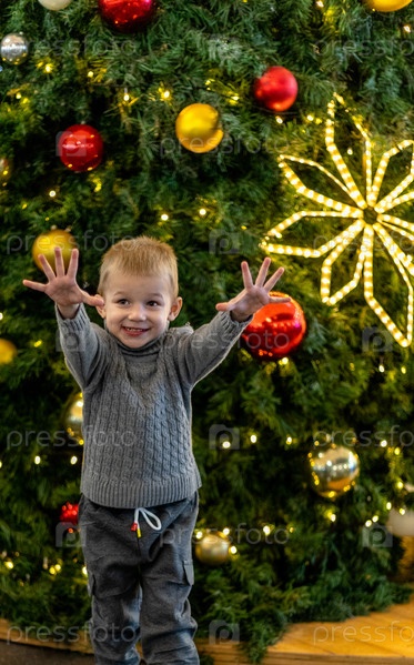 Счастливый белокурый мальчик на фоне украшенной елки. Концепция праздника, веселья, Рождества