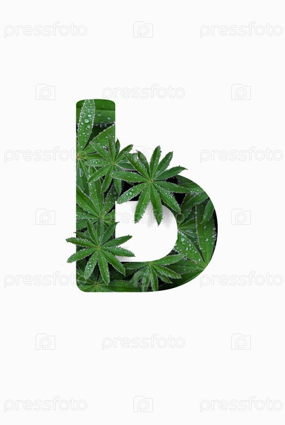 Русская заглавная буква алфавита Ь, выделенная на белом фоне. Стилизован под коллаж из фотографии листа цветка люпина
