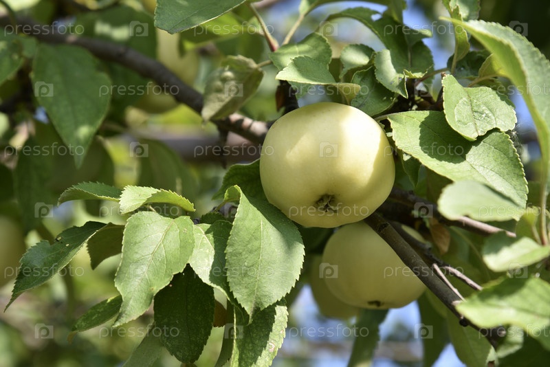 Желто-зеленые крупные яблоки на ветвях яблони осенью. Вкусные яблоки в саду