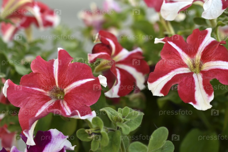 Красивые разноцветные цветы петунии на клумбе летом. Много цветов крупным планом