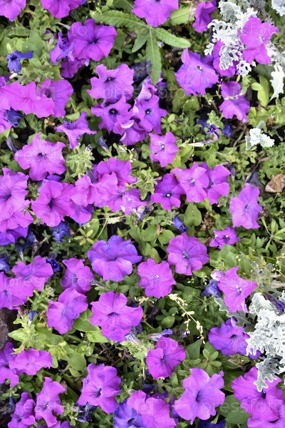 Красивые разноцветные цветы петунии на клумбе летом. Много цветов крупным планом