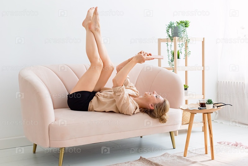 Счастливая стройная блондинка 30-40 лет лежит на спине на бежевом диване в яркой гостиной с растениями, подняв ноги, смотрит на цифровой планшет