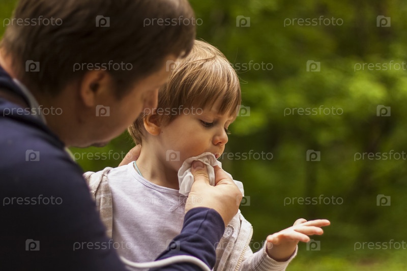 Отец заботится о своем маленьком сыне. Отец вытер лицо ребенка салфеткой
