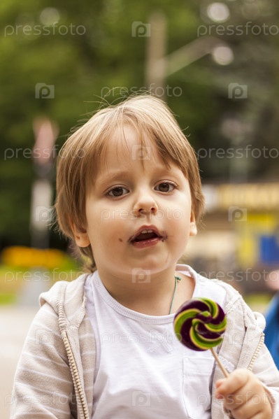 Портрет милого маленького мальчика, держащего большой круглый леденец на палочке. Младенец ест сладкий, большой леденец на палочке