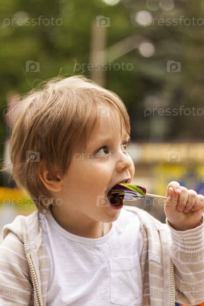 Портрет милого маленького мальчика, держащего большой круглый леденец на палочке. Младенец ест сладкий, большой леденец на палочке