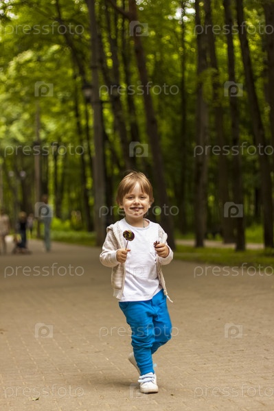 Симпатичный маленький мальчик держит на палочке большой круглый леденец. Радостные эмоции. Сладости для маленьких детей. Летние мероприятия на свежем воздухе. Дошкольник с леденцами