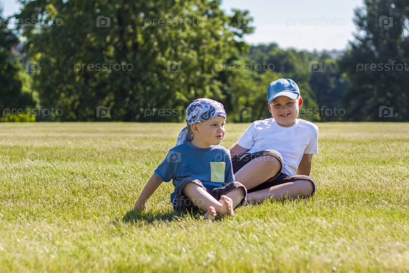 Веселые дети, два брата, радостно улыбаются. мы с удовольствием гуляем и играем на лужайке в теплую солнечную погоду в парке. эмоции детей на лице