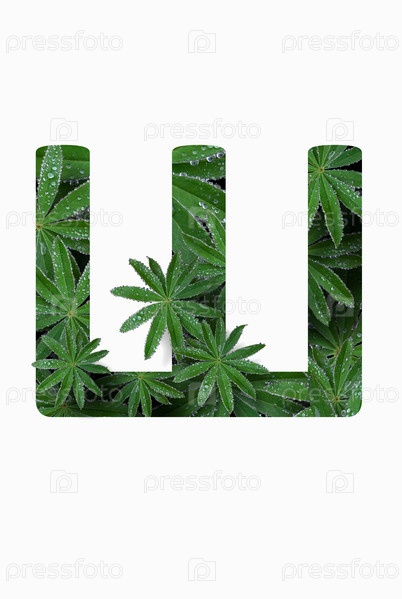 Русская заглавная буква алфавита Ш, выделенная на белом фоне. Стилизован под коллаж из фотографии листа цветка люпина
