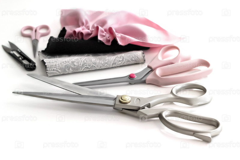 Предметы для шитья одежды: портновские ножницы, лоскуты ткани, кусачки для нитей