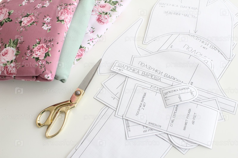 Бумажные выкройки одежды. Рядом с ним золотые ножницы и ткани