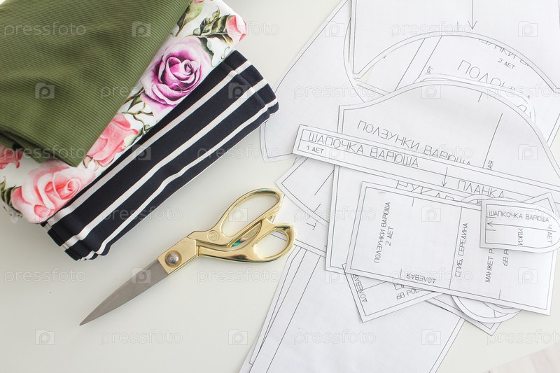 Бумажные выкройки одежды. Рядом есть ножницы и ткани