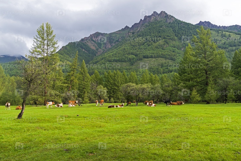 Стадо коров пасется на лугу в долине горной реки. Река Жомболок, Восточный Саян, Бурятия, Сибирь, Россия