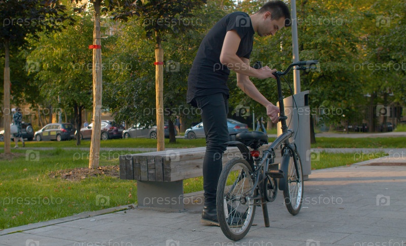 Мужчина готовит складной велосипед к поездке