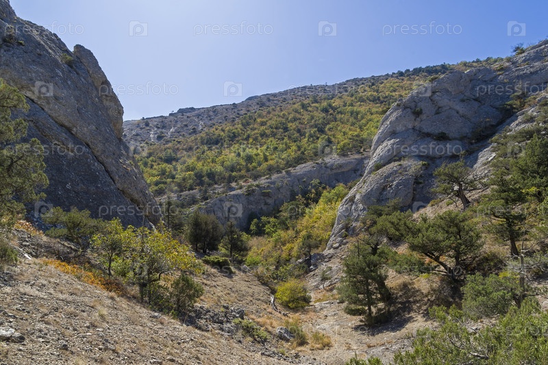 Небольшое ущелье в Крымских горах. Подножие горы Сокол (Куш-Кая), побережье Черного моря между Судаком и Новым Светом. Солнечный день в сентябре