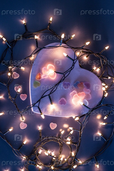Упакованный новогодний подарок на фоне включенной гирлянды крупным планом