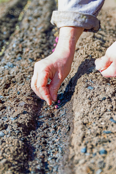 Фермеры вручную сажают семена зеленого горошка в почву. Его показывали весной. Концепция садоводства