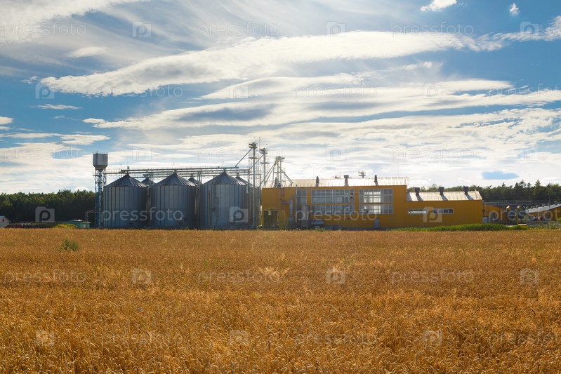 Агропромышленный комплекс по очистке и сушке зерна на пшеничном поле. Металлические цистерны для зерна