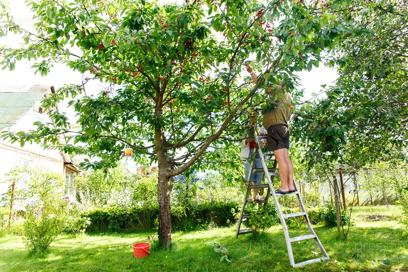 Пожилая пара собирает вишни в саду