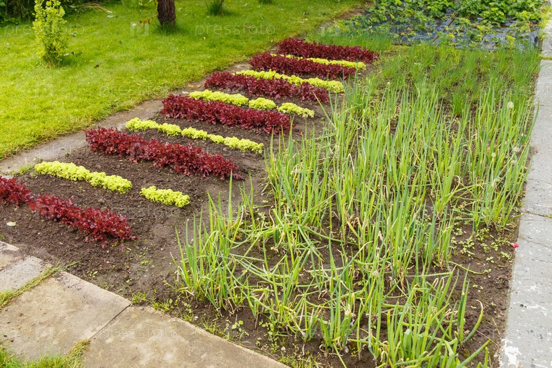 Грядки с луком и салатом в саду