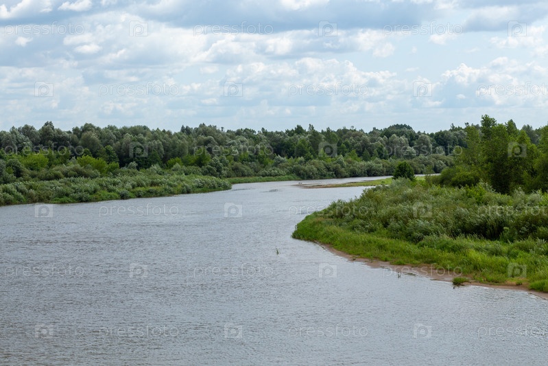 Вид на извилистую реку в сельской местности. Живописная природа реки Неман в Беларуси недалеко от Дубно