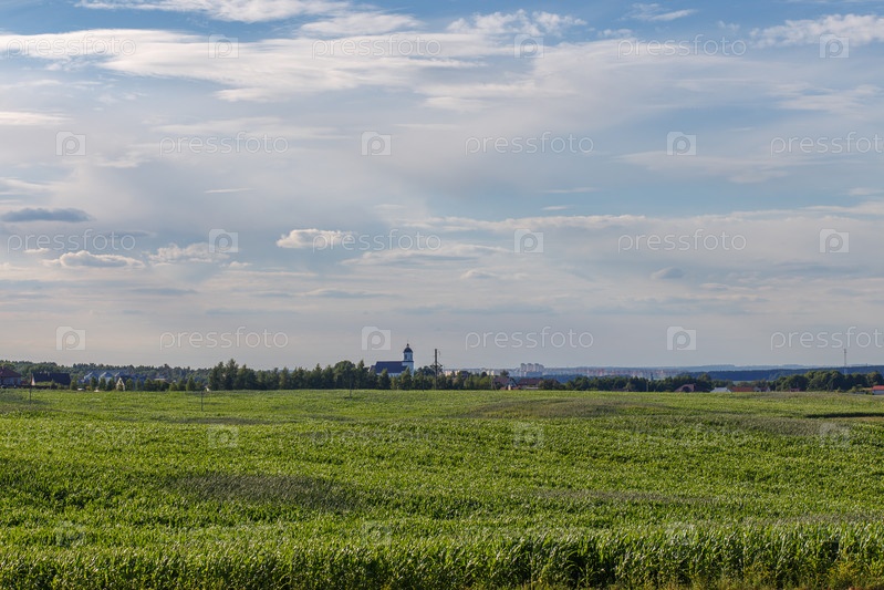 Зеленое поле с кукурузой под облачным небом