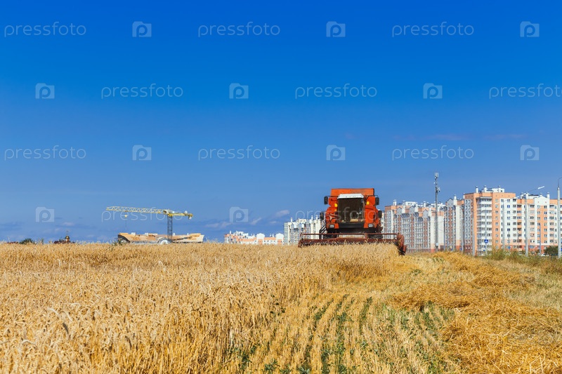 Комбайн убирает спелую пшеницу на зерновом поле возле жилого массива. Сельскохозяйственные работы летом. Заголовок крупным планом