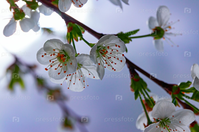 Вишни в цвету на солнечном фоне. Красивый весенний фон природы с веткой цветущей сакуры. крупным планом