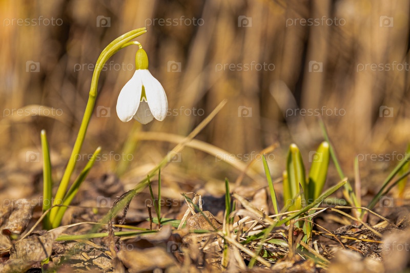 Подснежник - первый весенний цветок. Свежий зеленый белый ландыш, растущий в саду. Мартовский подснежник крупным планом