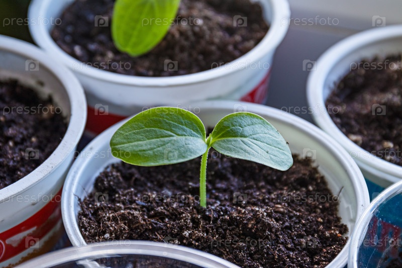 Молодые свежие саженцы огурцов стоят в пластиковых горшках на подоконнике