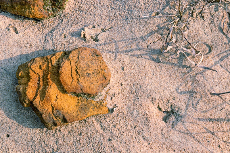 Красный камень песчаника на песке, сухая трава. пустынный пейзаж